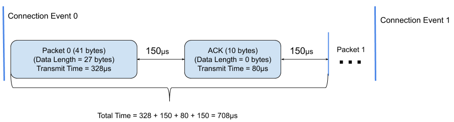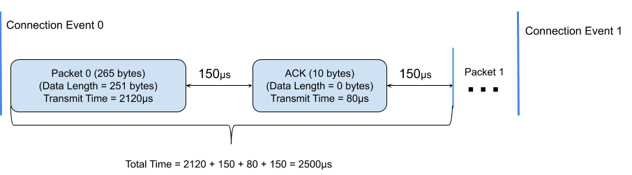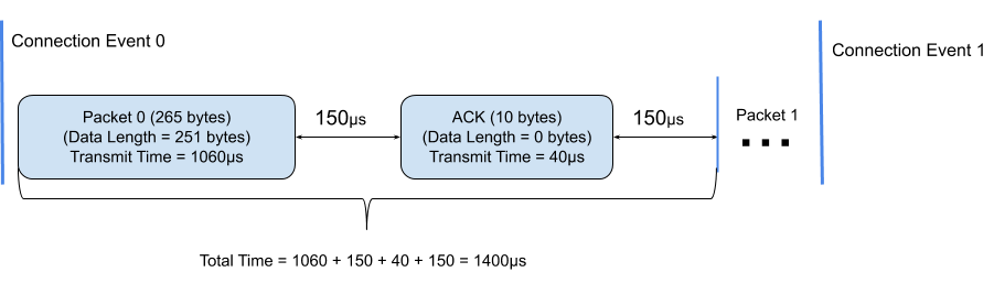 As mentioned above, as of Bluetooth 4.2, the size of a Link Layer data payload can be up to 251 bytes. However, not all devices support this maximal size. Ideally, you’ll want to test the chip you are using and make sure it supports the entire range. For optimal throughput you’ll want to make sure the connection interval is an integer multiple of the packet transmission time. We will walk through an example of this below