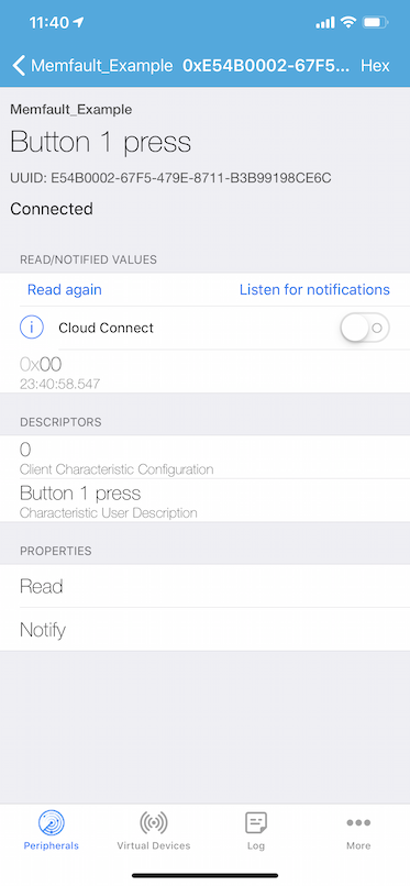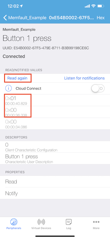 To verify that we can read the value of the Button 1 Characteristic, we can tap on “Read again”. To verify further, we can hold down Button 1 on the development board and then click “Read again”. This time it should display a value of 0x01.