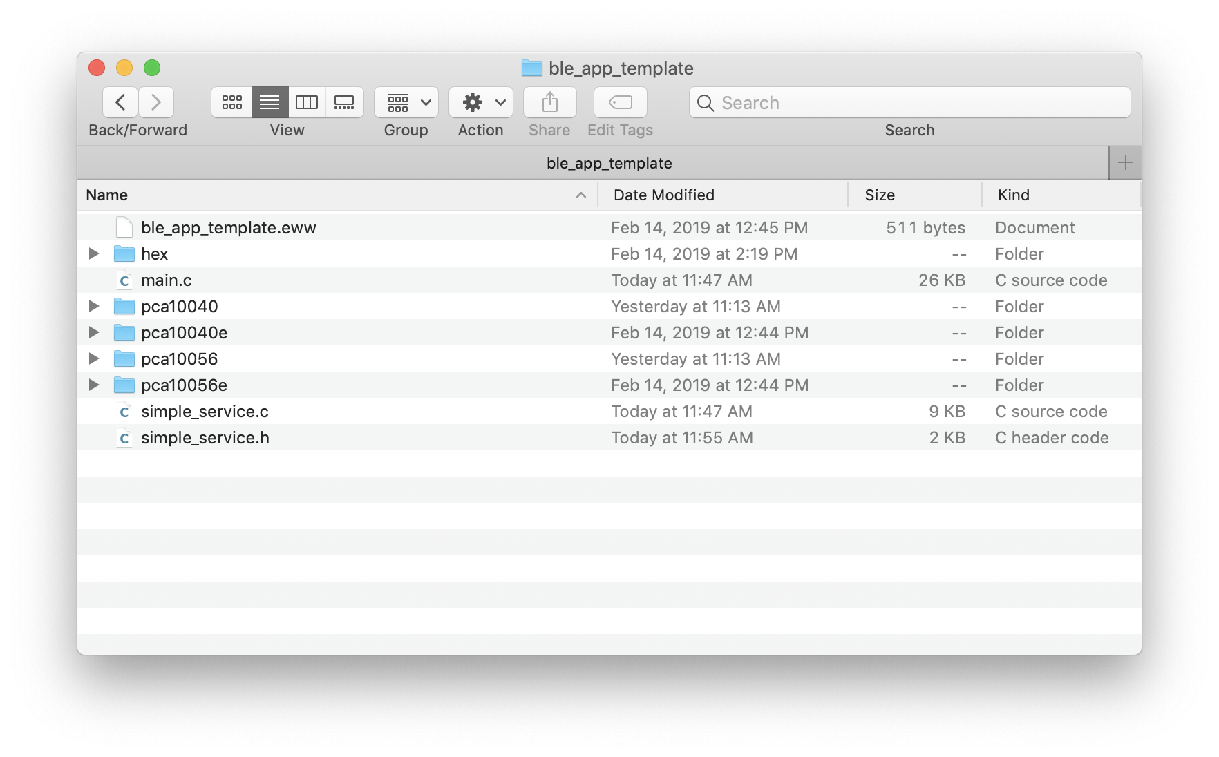 • Add the new Simple Service source code file to Makefile. We add $(PROJ_DIR)/simple_service.c to the Makefile file which is located at ble_peripheral/ble_app_template/pca10056/s140/armgcc/Makefile: