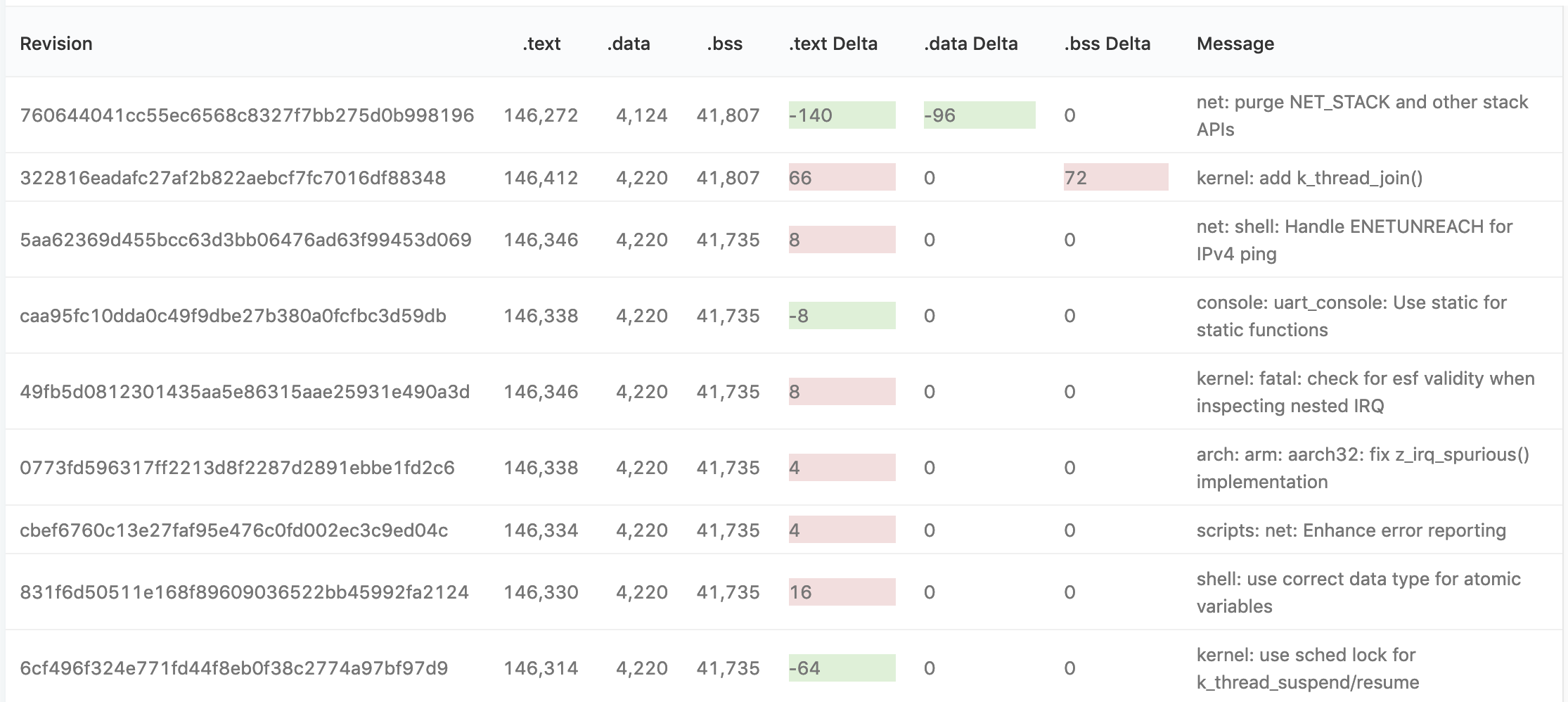It turns out this pull-request adds roughly 250B to the master branch for our example firmware build! With this information in hand, the maintainers of the Zephyr Project can then decide whether the change is worth the bump in the firmware size. (I’d ✅)